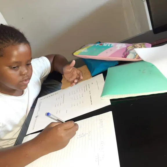 “My teacher aid comes to our house and we have a study room that my parents turned into a classroom. I have my morning snack break at 10am then I continue with my class until 12.30pm. Sometimes I have afternoon work but sometimes I just read a book from the online library or just play. I love Maths because it is so easy for me to understand numbers than words.”
